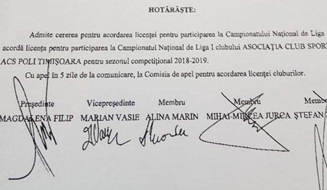 Aflată în drum spre liga secundă, ACS Poli Timișoara are cel puțin garanția că dacă scapă de retrogradare va putea juca și sezonul viitor în Liga 1. Aflată în mari lipsuri financiare, cu salarii rămase în urmă și jucători cu memorii depuse pentru neplată, oficialii clubului au reușit să întocmească dosarul în așa fel încât clubul să primească licența de joc pentru sezonul viitor.