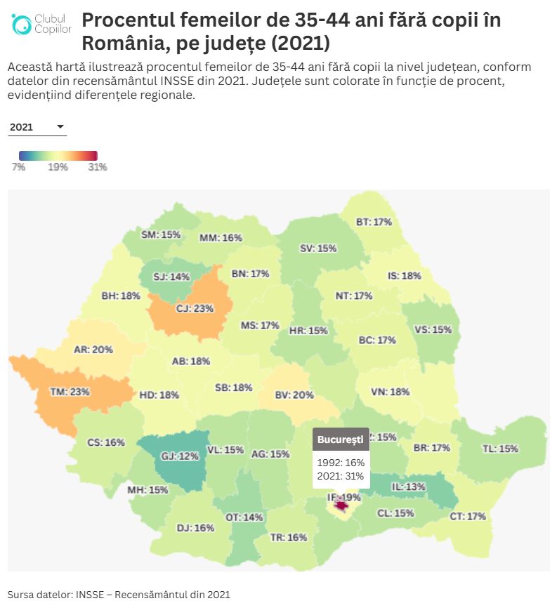 Un alt efect este faptul că tot mai multe femei din categoria 35-44 de ani aleg să nu aibă copii deloc. Dacă în 1992 doar 10% dintre femeile din această categorie nu aveau copii, în 2021 procentul a ajuns la 19%.
