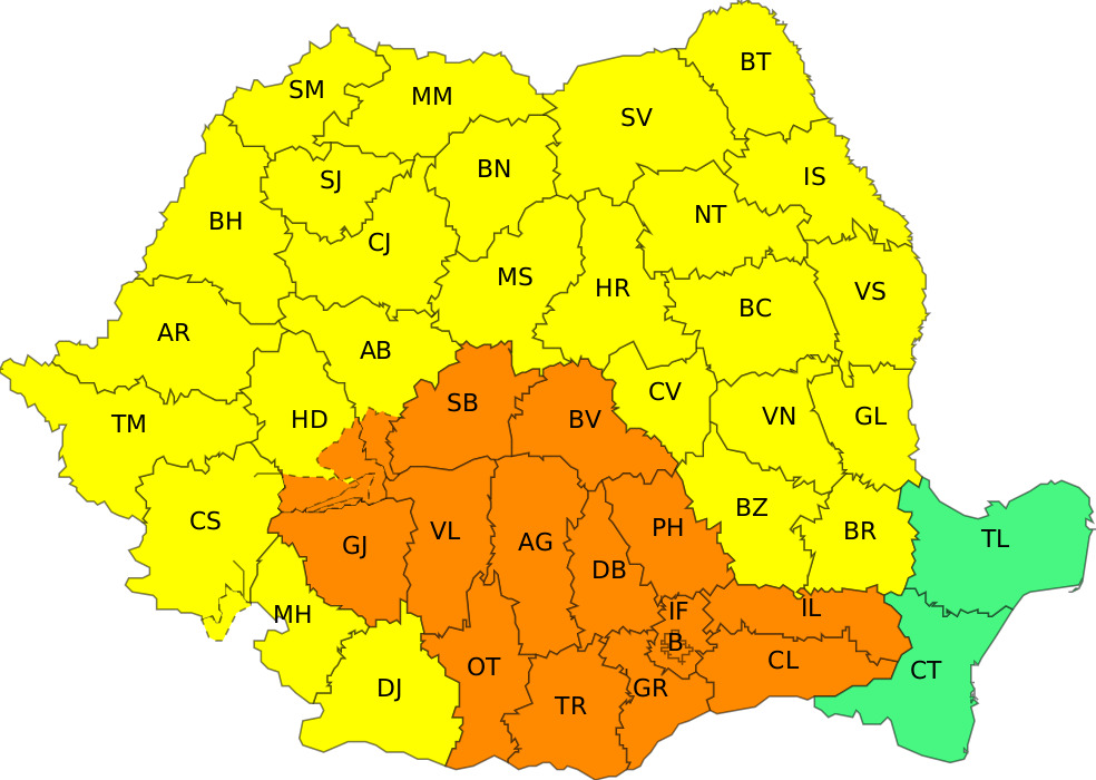 Tot în același interval este în vigoare și un Cod Portocaliu de ploi torențiale și abundente, valabil în nordul și estul Olteniei, cea mai mare parte a Munteniei și sudul Transilvaniei. În intervalul menționat, în nordul și estul Olteniei, în cea mai mare parte a Munteniei și sudul Transilvaniei, vor fi perioade cu ploi torențiale și abundente. În intervale scurte de timp și prin acumulare cantitățile de apă vor fi de 50…70 l/mp și izolat de peste 80 l/mp.