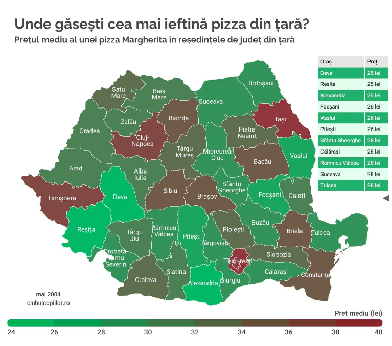 clubulcopiilor.ro a făcut recent o analiză pentru a determina prețul mediu al unei pizza în toate orașele reședință de județ din țară. Astfel, printre diversele tipuri de pizza, pizza Margherita – primul tip de pizza inventat acum mai bine de o sută de ani în Napoli, care conține aluat de pizza, mozzarela, sos roșii și busuioc, se remarcă drept o preferată universală, inclusiv în rândul copiilor.