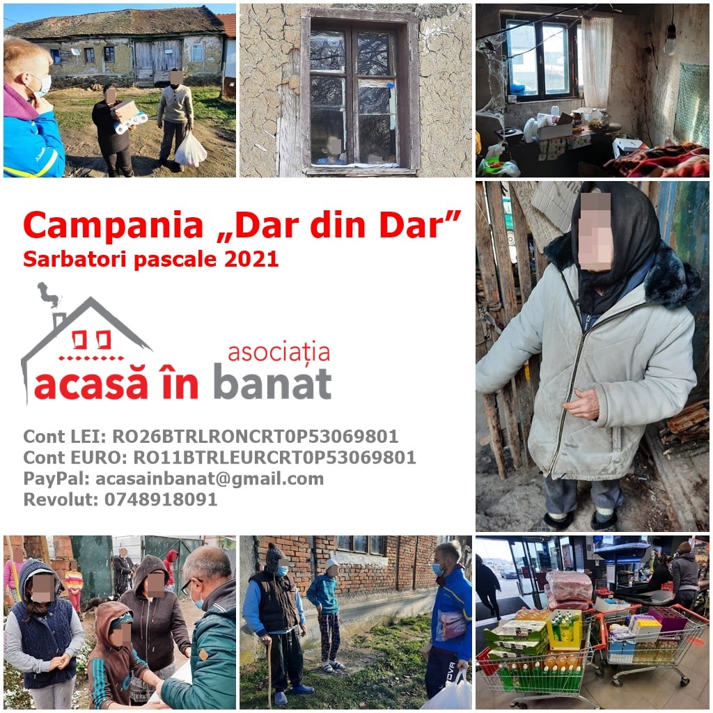 „Pentru că nu putem rămâne indiferenți nici acum, deschidem o nouă campanie Dar din Dar prin care ne dorim să ajungem la cel puțin 100 de familii necăjite din Banat, bătrâni singuri sau familii cu mulți copii, pentru a le aduce și lor puțină lumină cu ocazia Învierii”, spun reprezentanții Asociației Acasă în Banat, pe Facebook.