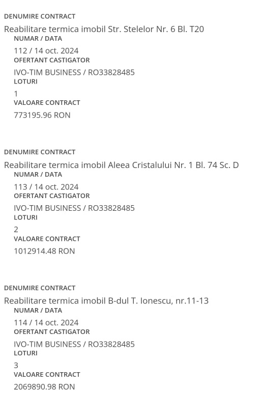 Mai exact, este vorba despre blocurile de pe strada Stelelor, nr. 6, Aleea Cristalului, nr. 1 și bulevardul Take Ionescu, nr. 11-13. Acestea au 162 de apartamente. Contractele au o valoare totală de 3,85 de milioane de lei, fără TVA. Adică 4,58 de milioane de lei sau 920.000 de euro, cu TVA.