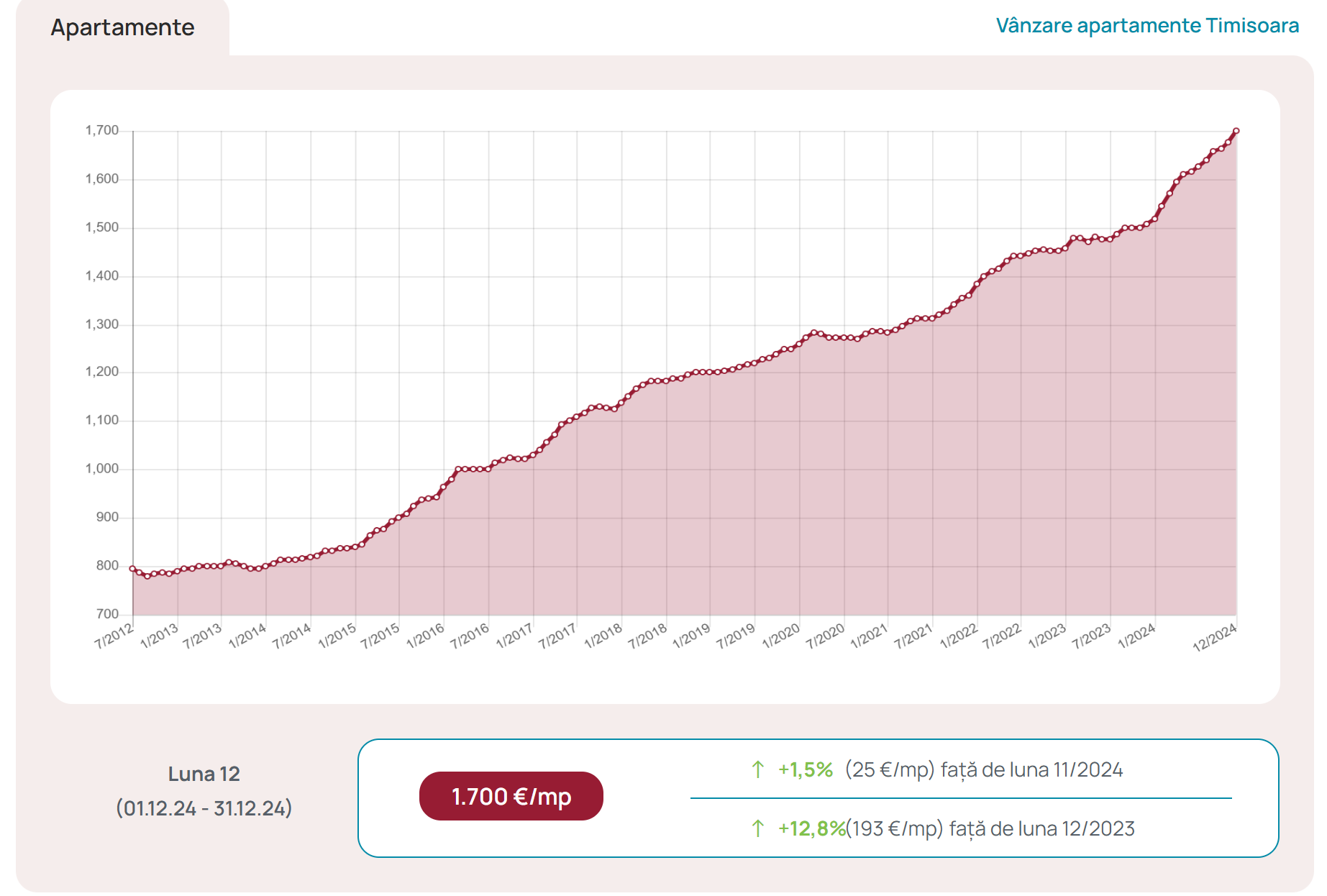 Indicele Imobiliare.ro arată că prețul mediu cerut pentru apartamentele din Timișoara a ajuns, în decembrie 2024, la 1.700 de euro pe metru pătrat util. La apartamentele vechi, vorbim despre 1.659 €/mp, iar cele noi, și mai mult – 1.994 €/mp. La începutul anului trecut, prețurile medii erau de 1.496, respectiv 1.795 €/mp.