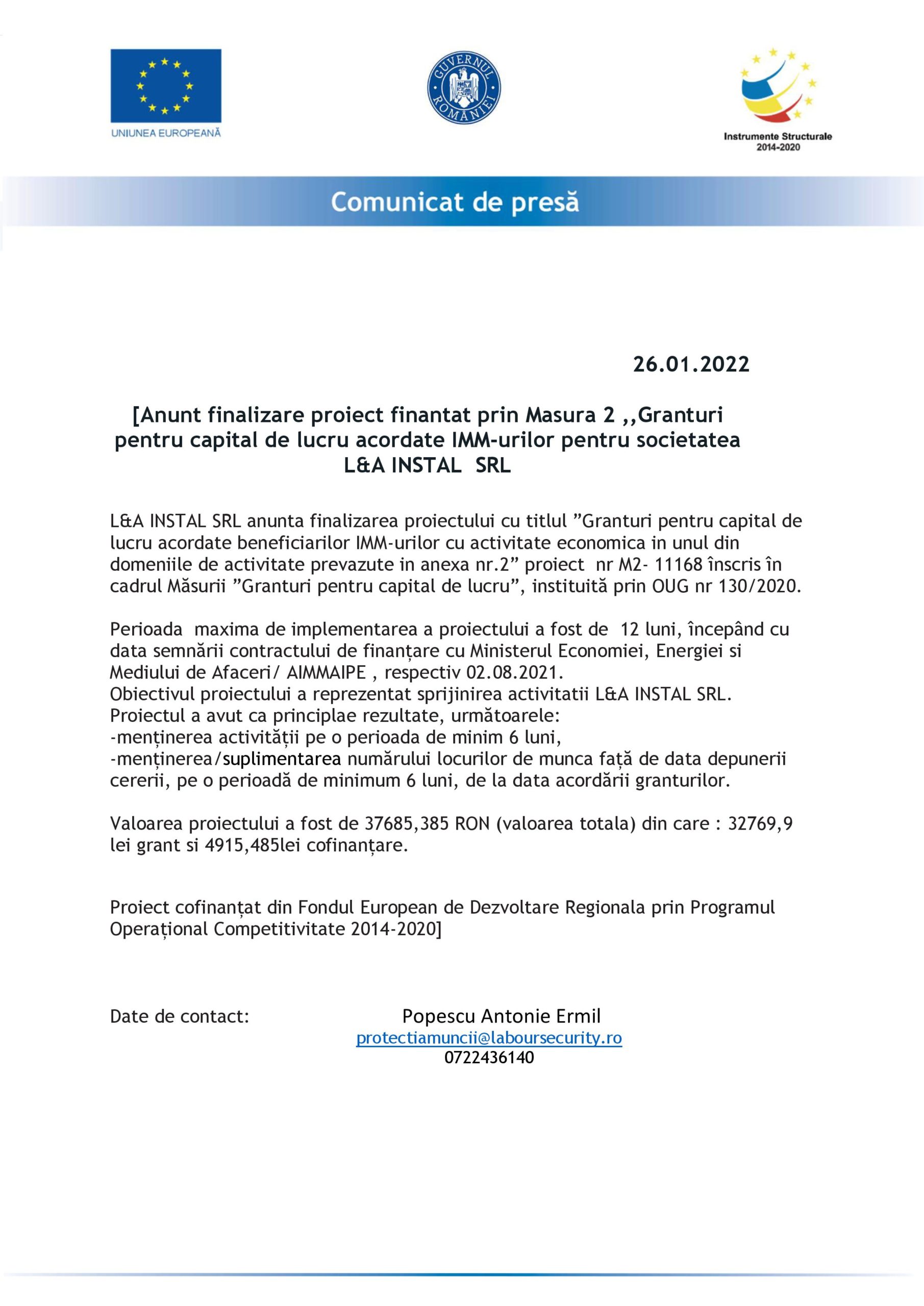 L&A INSTAL SRL anunta finalizarea proiectului cu titlul ”Granturi pentru capital de lucru acordate beneficiarilor IMM-urilor cu activitate economica in unul din dome-niile de activitate prevazute in anexa nr.2” proiect nr M2- 11168 înscris în cadrul Măsurii ”Granturi pentru capital de lucru”, instituită prin OUG nr 130/2020.