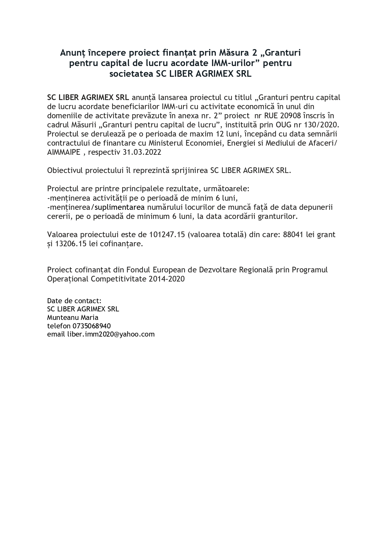 Anunț începere proiect finanțat prin Măsura 2 „Granturi pentru capital de lucru acordate IMM-urilor” pentru societatea SC LIBER AGRIMEX SRL