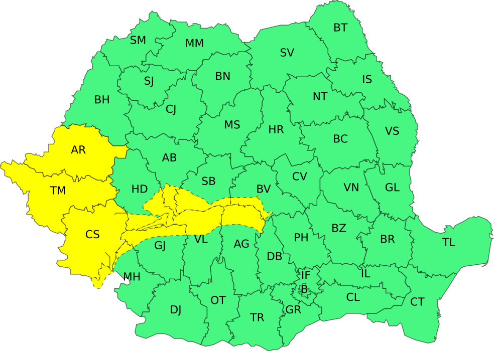 În plus, de astăzi, începând cu ora 23, până mâine, la ora 21, intră în vigoare un Cod Galben de intensificări ale vântului. În intervalul menționat, vântul va avea intensificări în Banat, sudul Crișanei și în Carpații Meridionali, cu viteze în general de 55…65 km/h, iar pe creste rafalele vor depăși 70…80 km/h, mai spun meteorologii.