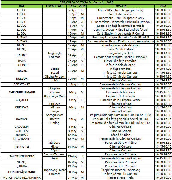 Locuitorii din localitățile menționate pot preda gratuit, prin aport voluntar, deșeurile periculoase din menajer în containerele special amenajate, disponibile în punctele de colectare, conform programului din tabelul de mai jos.