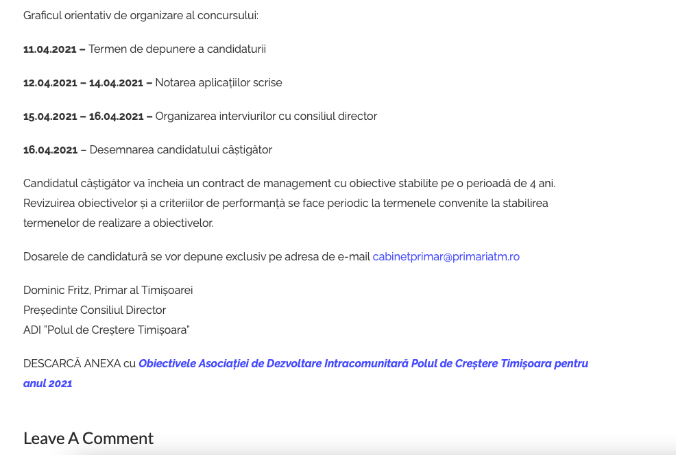 Vă reamintim, PMT și ADI făceau public, în martie, că Asociația de Dezvoltare Intercomunitară „Polul de Creștere Timișoara” caută un director general. Candidaturi s-au putut depune până în 11 aprilie, „exclusiv pe adresa de e-mail cabinetprimar@primariatm.ro”, pentru ca până în 14 aprilie să se facă „notarea aplicațiilor scrise”, iar până în 16 să fie organizat interviul și în 16 aprilie să fie desemnat candidatul câștigător.