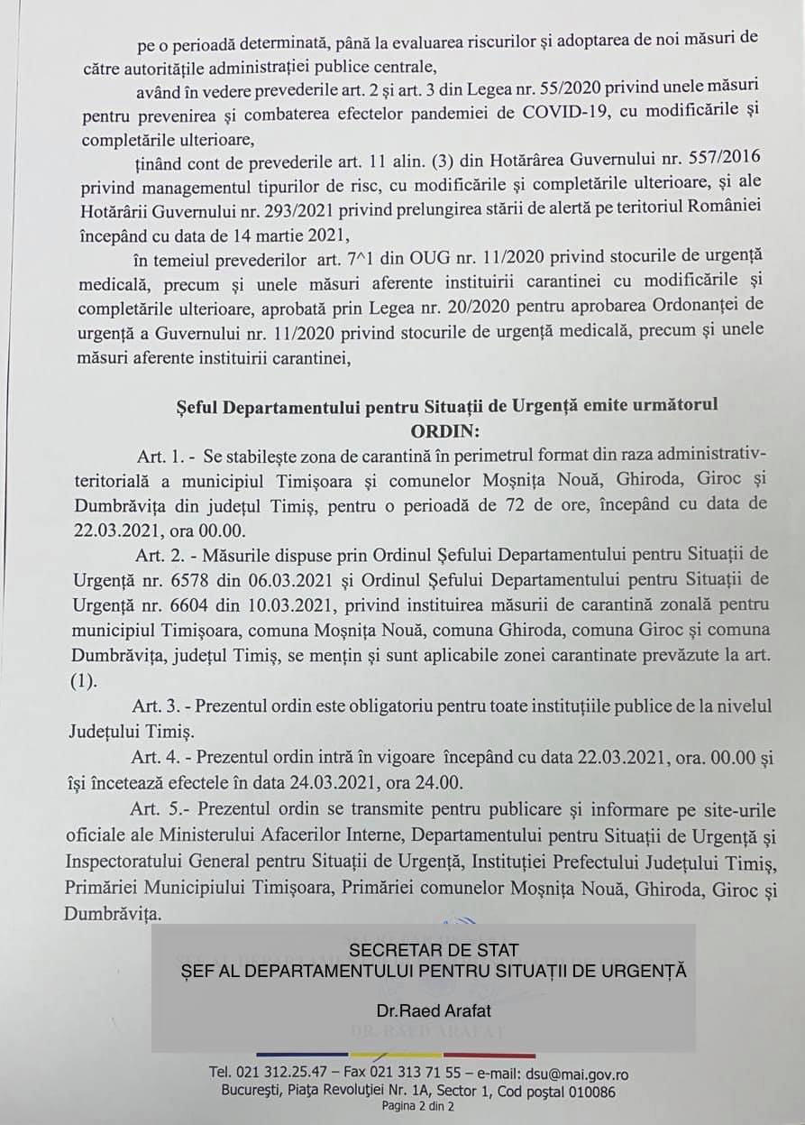 Raed Afarat a semnat ordinul DSU nr. 6699 duminică seară, pentru o carantină de 72 de ore, din 22 până în 24 martie inclusiv, în Timișoara, Dumbrăvița, Ghiroda, Moșnița Nouă și Giroc. În document specifică faptul că s-a ținut cont „de lipsa întrunirii numărului minim de voturi care să permită adoptarea măsurilor necesar a fi aplicate pentru limitarea și controlul răspândirii intracomunitare a virusului SARS-CoV2 la nivelul perimetrului de referință”, dar și de consultarea cu Ministerul Sănătății.