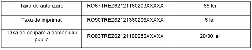 - taxa de ocupare a domeniului public – 2 lei/mp/zi, respectiv 3 lei/mp/zi în zona centrală, care se vor achita anticipat pe toată perioada de autorizare, la casieria camerei 12, la momentul înregistrării cererii după emiterea notei de plata de la ghișeul 8 sau 9, fără posibilitatea restituirii acestor taxe.