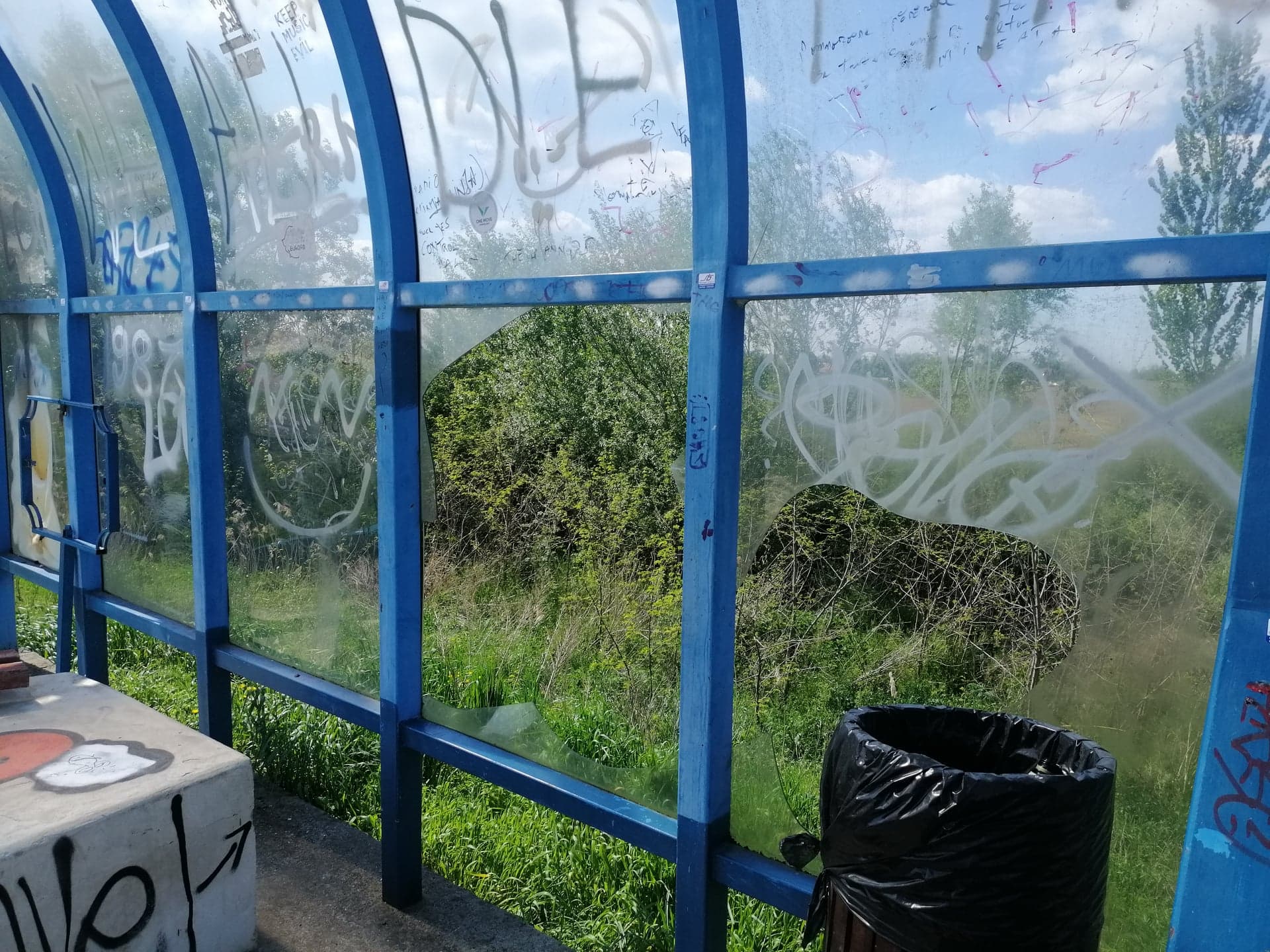 De distrugere nu au scăpat nici stațiile de refugiu de pe marginea drumului pentru biciclete. Acestea au fost mâzgălite cu spray, iar într-un coș de gunoi al uneia dintre ele a fost făcut și focul.