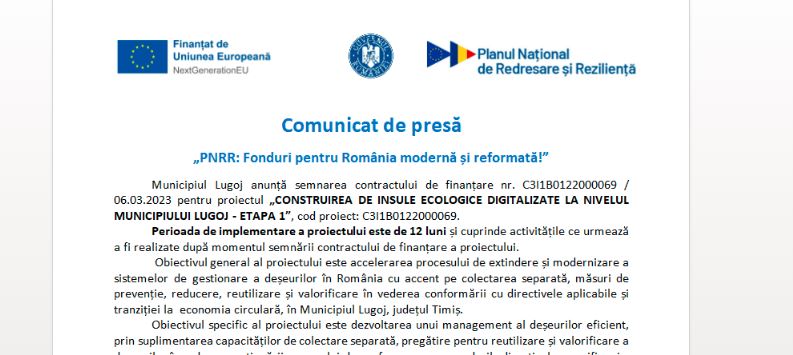 Municipiul Lugoj anunță semnarea contractului de finanțare nr. C3I1B0122000069 / 06.03.2023 pentru proiectul „CONSTRUIREA DE INSULE ECOLOGICE DIGITALIZATE LA NIVELUL MUNICIPIULUI LUGOJ - ETAPA 1”, cod proiect: C3I1B0122000069.