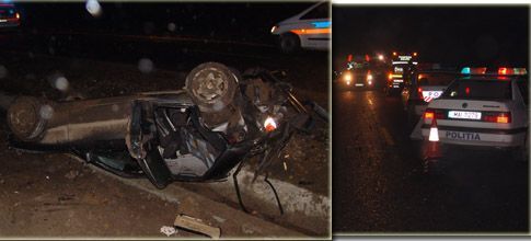 Trei tineri au ajuns la spital în noaptea de marţi spre miercuri după ce s-au răsturnat cu maşina, un Mercedes, într-un şanţ din beton de pe marginea drumului. În urma impactului, şoferul a rămas blocat în autoturism care s-a oprit cu rotile in sus, iar cei doi pasageri au fost proiectaţi afară, în câmp.