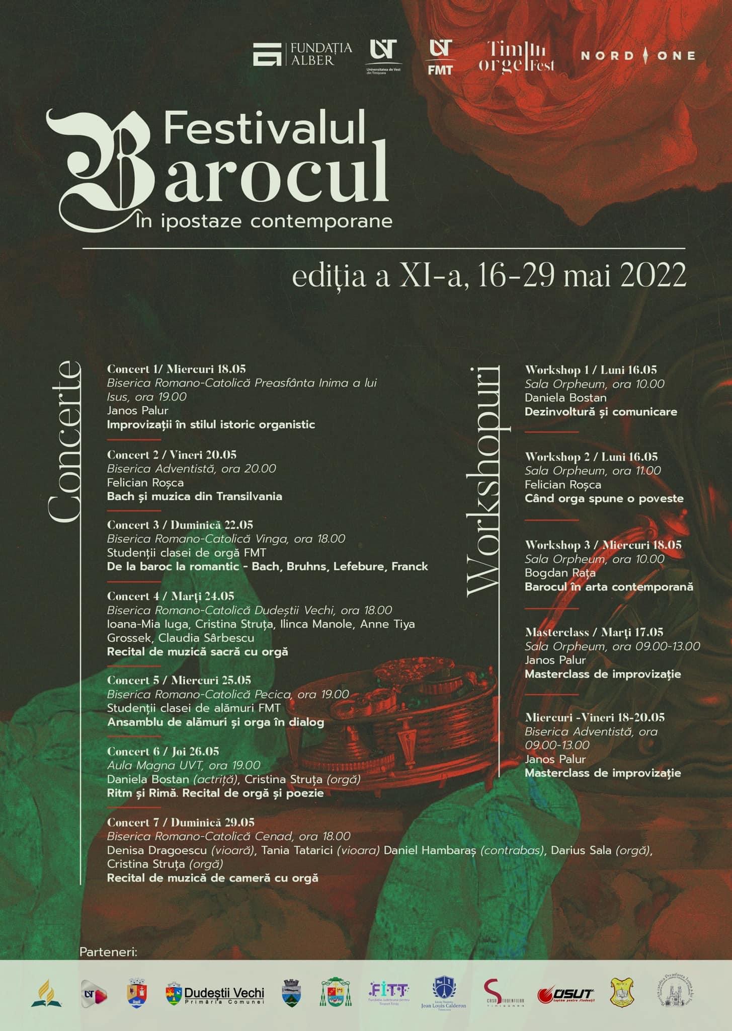 Festivalul Barocul în Ipostaze Contemporane se desfășoară în perioada 16 – 29 mai 2022 la Timișoara, Cenad, Pecica, Dudeștii Vechi și Vinga. Festivalul cuprinde trei workshopuri, un masterclass de improvizație susținut de organistul maghiar Janos Palur, două concerte de orgă, un recital de orgă și poezie, un recital de muzică sacră cu orgă, recital de ansamblu de alămuri cu orgă, recital de muzică de cameră cu orgă.