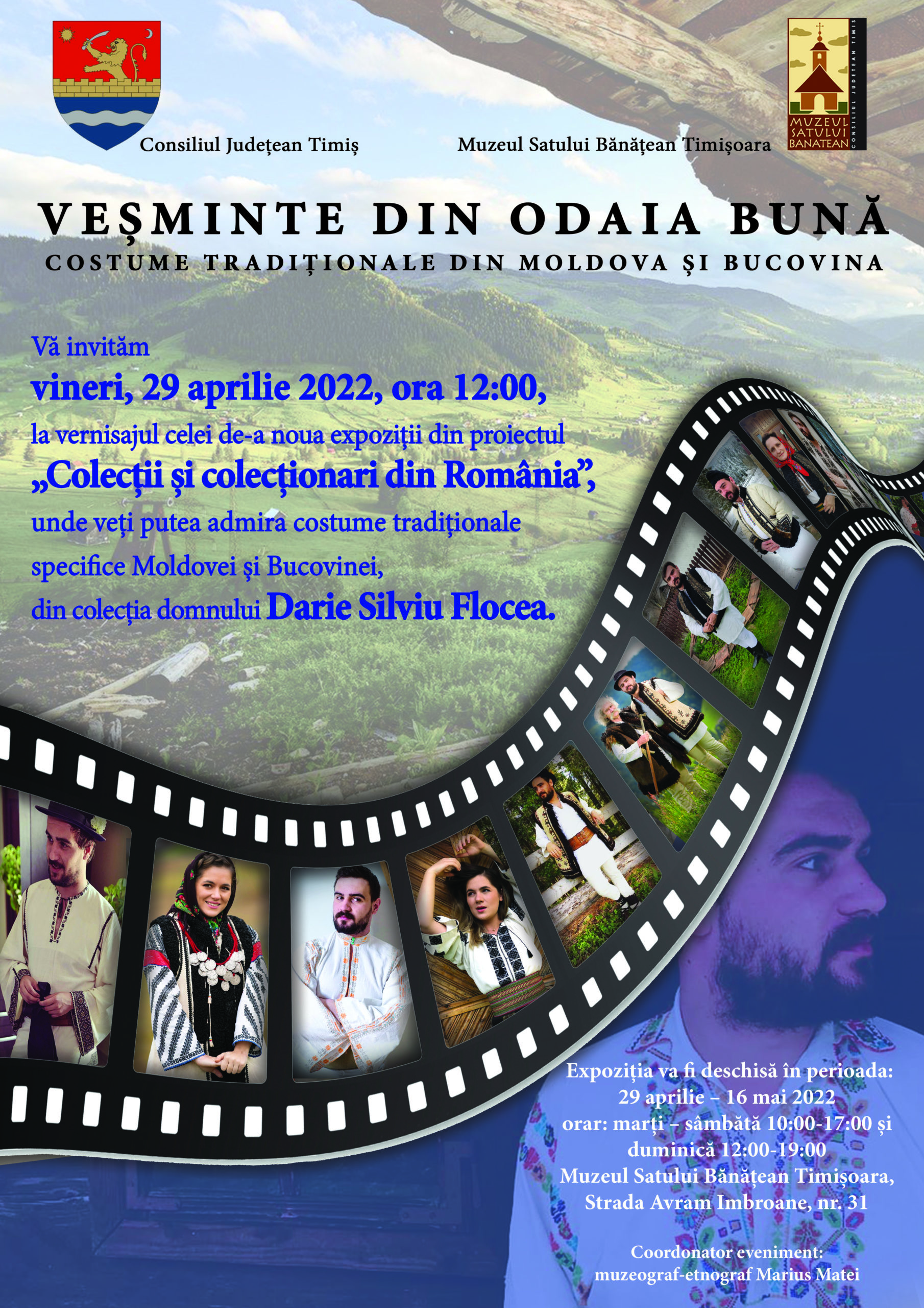 Vineri, 29 aprilie, de la ora 12, are loc vernisajul expoziției „Veșminte din Odaia bună, Costume tradiționale din Bucovina și Moldova”, cea de-a noua expoziție din cadrul proiectului „Colecții și colecționari din România”, la Muzeului Satului Bănățean.