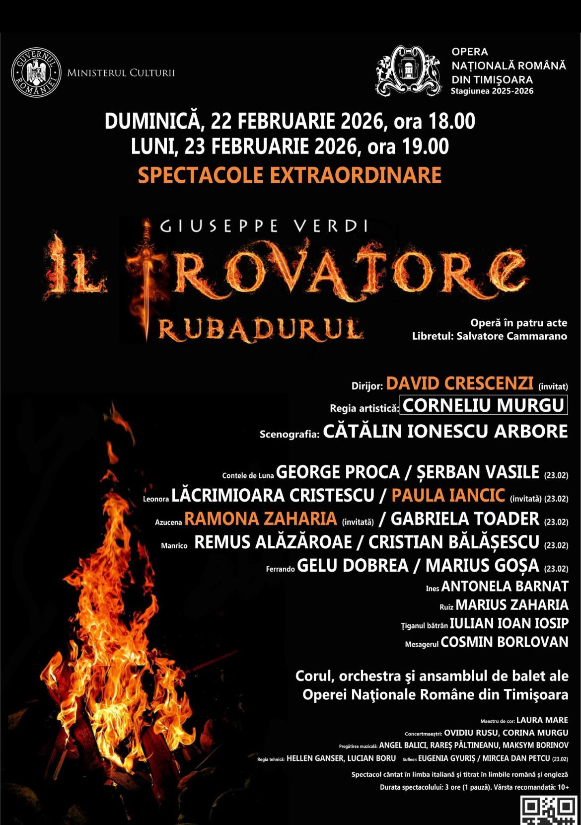 Opera Națională Română din Timișoara propune publicului două reprezentații extraordinare ale operei „Il Trovatore” („Trubadurul”) de Giuseppe Verdi, duminică, 22 februarie, de la ora 18, și luni, 23 februarie, ora 19. La pupitrul orchestrei se va afla dirijorul invitat David Crescenzi.