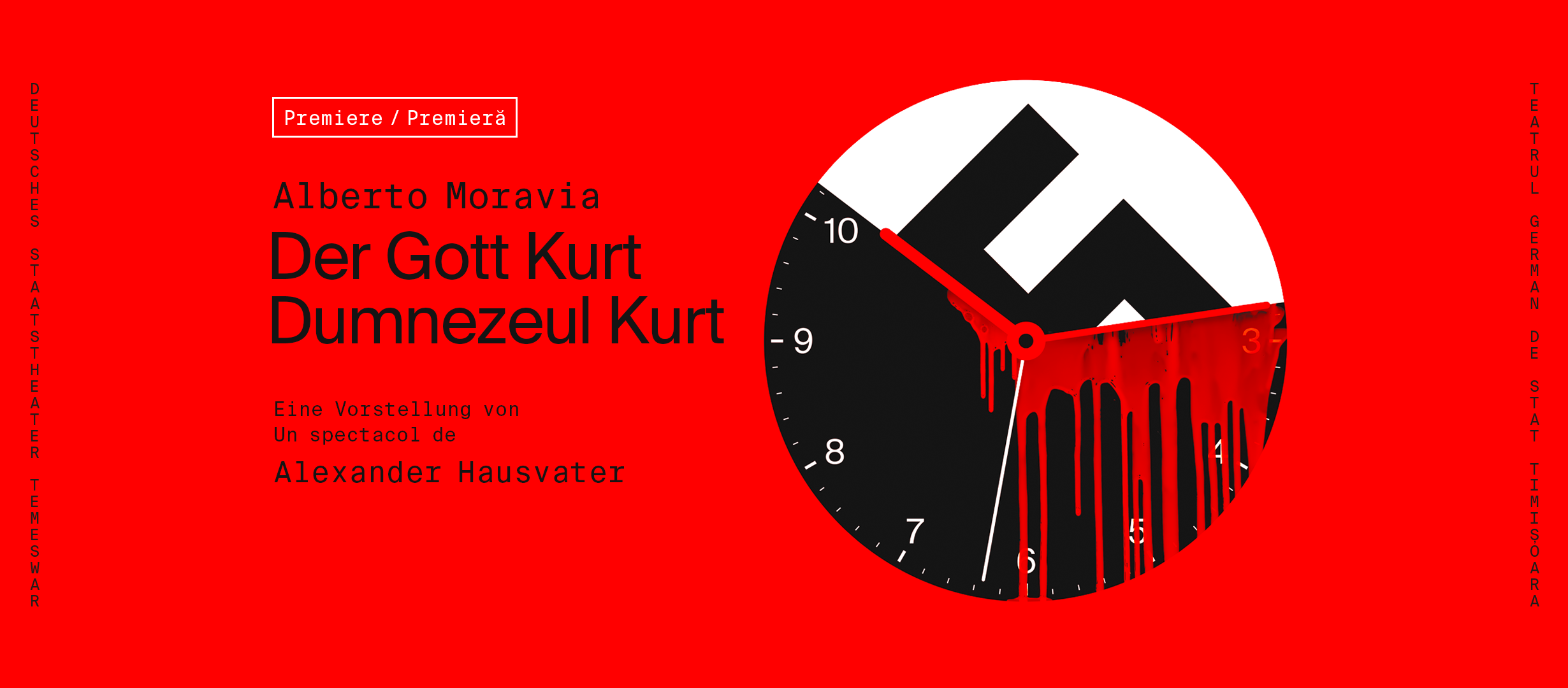 Premiera piesei „Dumnezeul Kurt” în regia lui Alexander Hausvater, regizor premiat UNITER, care semnează montarea și dramaturgia piesei semnată de Alberto Moravia va avea loc vineri, 20 mai, începând cu ora 19:30.