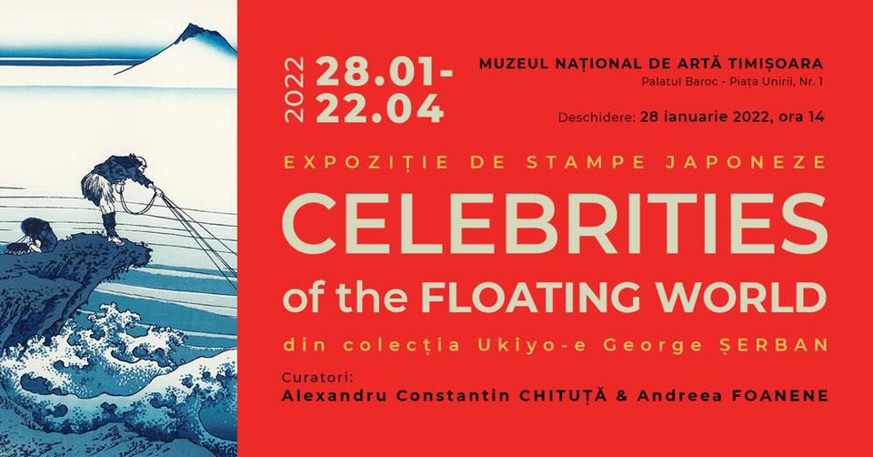 Vernisajul expoziţiei „Celebrities of the Floating World 2022” va avea loc vineri, 28 ianuarie, de la ora 14, în Sala Barocă a Muzeului Național de Artă Timișoara, din Piața Unirii, nr. 1. Alături de discursurile curatorilor Alexandru Chituță și Andreea Foanene, va avea loc un tur ghidat al expoziției, oferit publicului de colecționarul George Șerban.