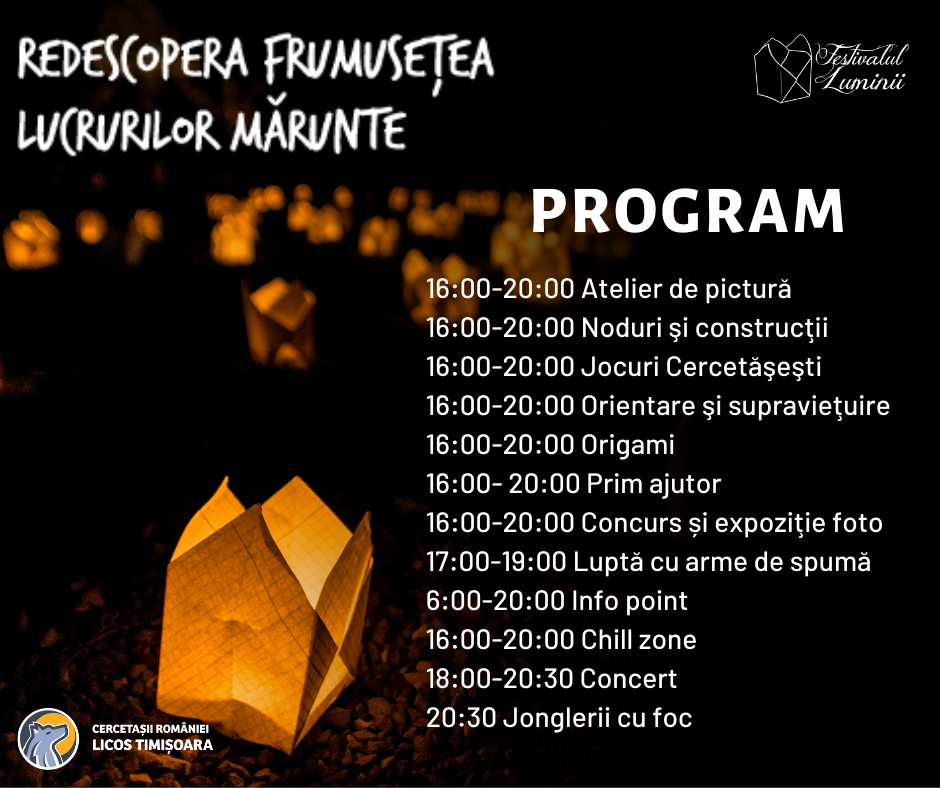 „În cadrul festivalului, am pregătit un concurs pentru pasionații de fotografie care au ocazia să își expună cele mai creative fotografii, iar pentru cei ce îndrăgesc muzica, atmosfera va fi întreținută de tinerele talente. Pentru cei care își doresc să se relaxeze după o săptămână lungă, cercetașii au pregătit o zonă de relaxare înconjurată de lumină și magie, iar dacă încă mai ai energie, ești invitat să îți inviți prietenii la o luptă cu arme de spumă. O dată cu lăsarea întunericului, parcul se va lumina datorită miilor de gulguțe (cutii de hârtie cu o lumânare înăuntru), iar cei de la Deep6 Project vor susține un spectacol de jonglerii cu foc”, transmit organizatorii.