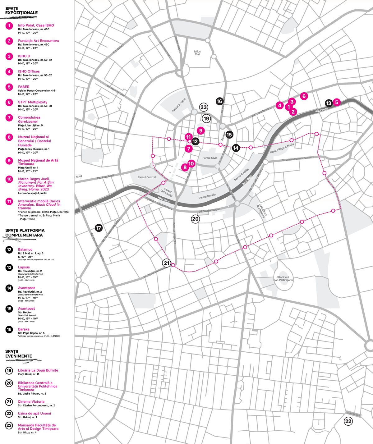 Pentru acest eveniment dedicat artei contemporane, mai multe spații expoziționale – clasice sau mai puțin convenționale – au fost activate în Timișoara. Printre acestea se numără Fundația Art Encounters, Comenduirea Garnizoanei Timișoara, Faber, Birourile ISHO, Muzeul Național de Artă, Muzeul Național al Banatului, STPT Multiplexity sau Tramvaiul Turistic.