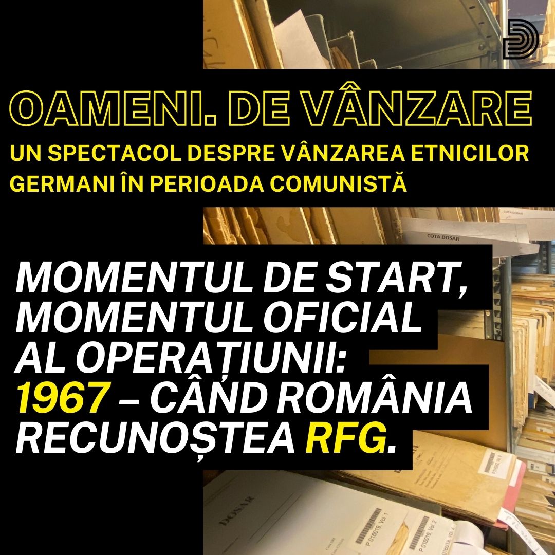 În timp ce regizoarea și autoarea piesei, Carmen Lidia Vidu, cerceta arhivele Consiliului Național pentru Studierea Arhivelor Securității (CNSAS), TGST a intervievat câteva din persoanele pentru care plecarea rămâne o tragedie personală. Cu spectacolul <Oameni. De vânzare>, dorim să îndreptăm privirile, în special pe cele ale generațiilor tinere, înspre ideologia inumană și cinică a comunismului”, transmit reprezentanții Teatrului German.