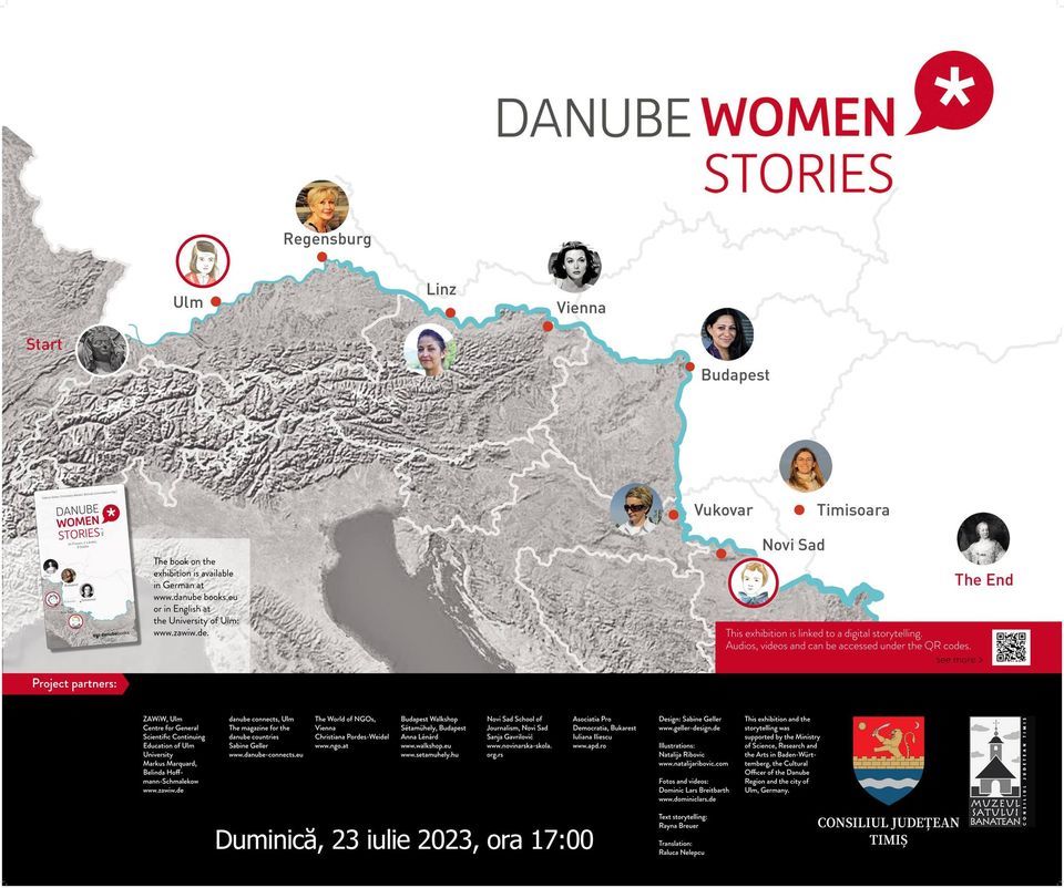 Portrete ale unor personalități feminine din țările riverane Dunării vor fi prezentate în cadrul unei expoziții care va fi vernisată la Muzeul Satului Bănățean din Timișoara, duminică, 23 iulie, la ora 17.00. Expoziția prezintă femeile ca figuri istorice și activitatea lor, precum și femeile din societatea actuală și contribuția lor relevantă la societate.