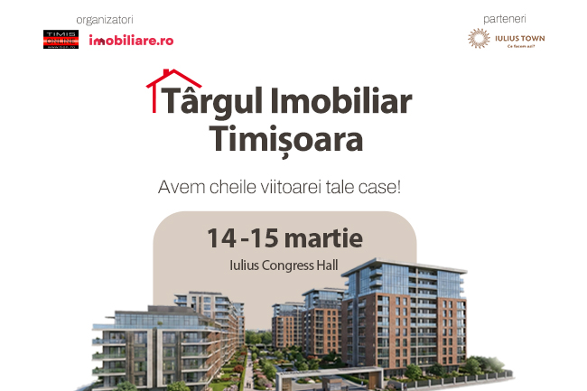 Târgul Imobiliar Timișoara (TIT), ediția de primăvară, va avea loc în 14–15 martie, la Iulius Congress Hall, reunind cei mai mari dezvoltatori din vestul țării. Vizitatorii vor putea descoperi apartamente, case și terenuri, vor beneficia de consultanță gratuită și vor discuta direct cu bănci și specialiști în design interior. Intrarea este liberă, iar organizatorii anunță oferte și reduceri exclusive disponibile doar în cadrul evenimentului.
