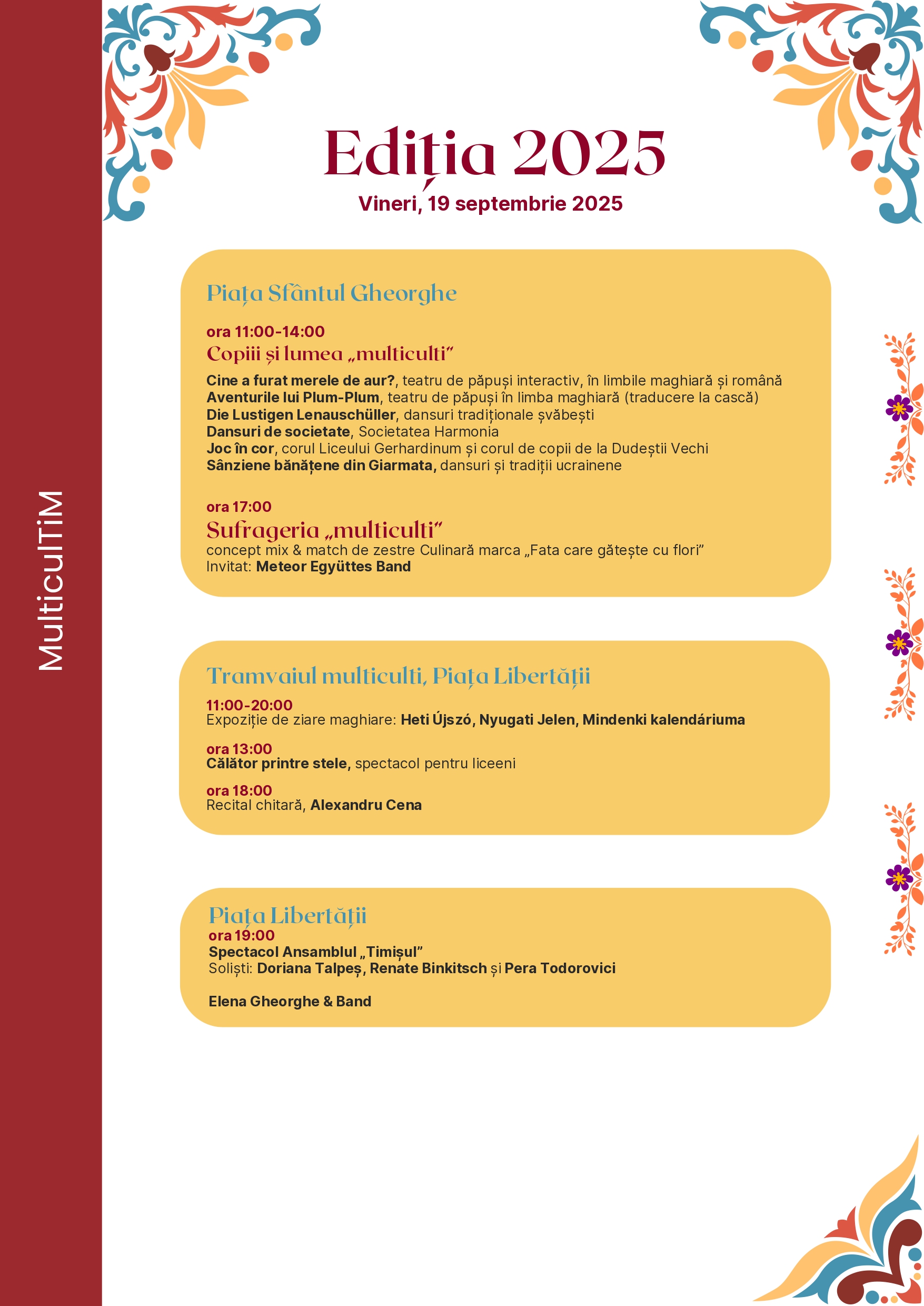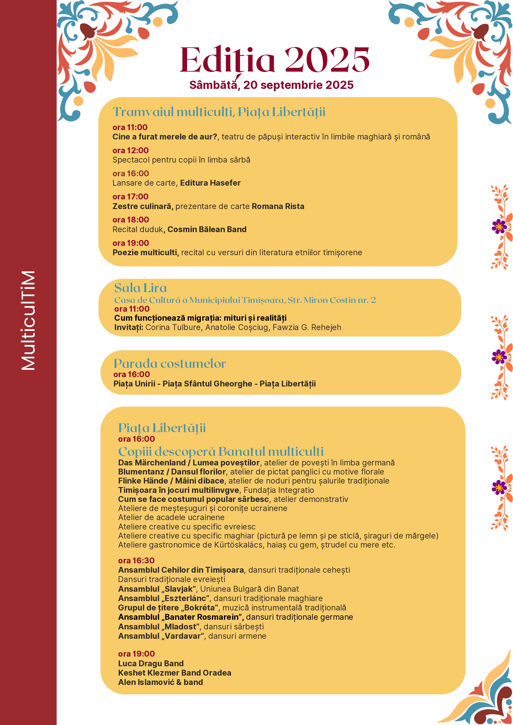 Evenimentul MulticulTIM – Festivalul Minorităților Etnice va aduce în prim-plan diversitatea culturală a orașului, prin spectacole susținute de ansamblurile minorităților, ateliere creative pentru toate vârstele, momente muzicale și dansuri tradiționale, expoziții și activități interactive.