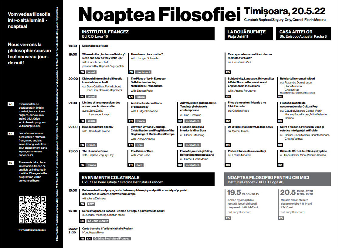 „După succesul primei ediții, a doua Noapte a Filosofiei se va desfășura sub același format, spre deliciul pasionaților de filosofie din Timișoara. Primirea călduroasă de care s-a bucurat evenimentul în 2021 ne determină să credem că ar trebui să devină o tradiție a scenei intelectuale românești.