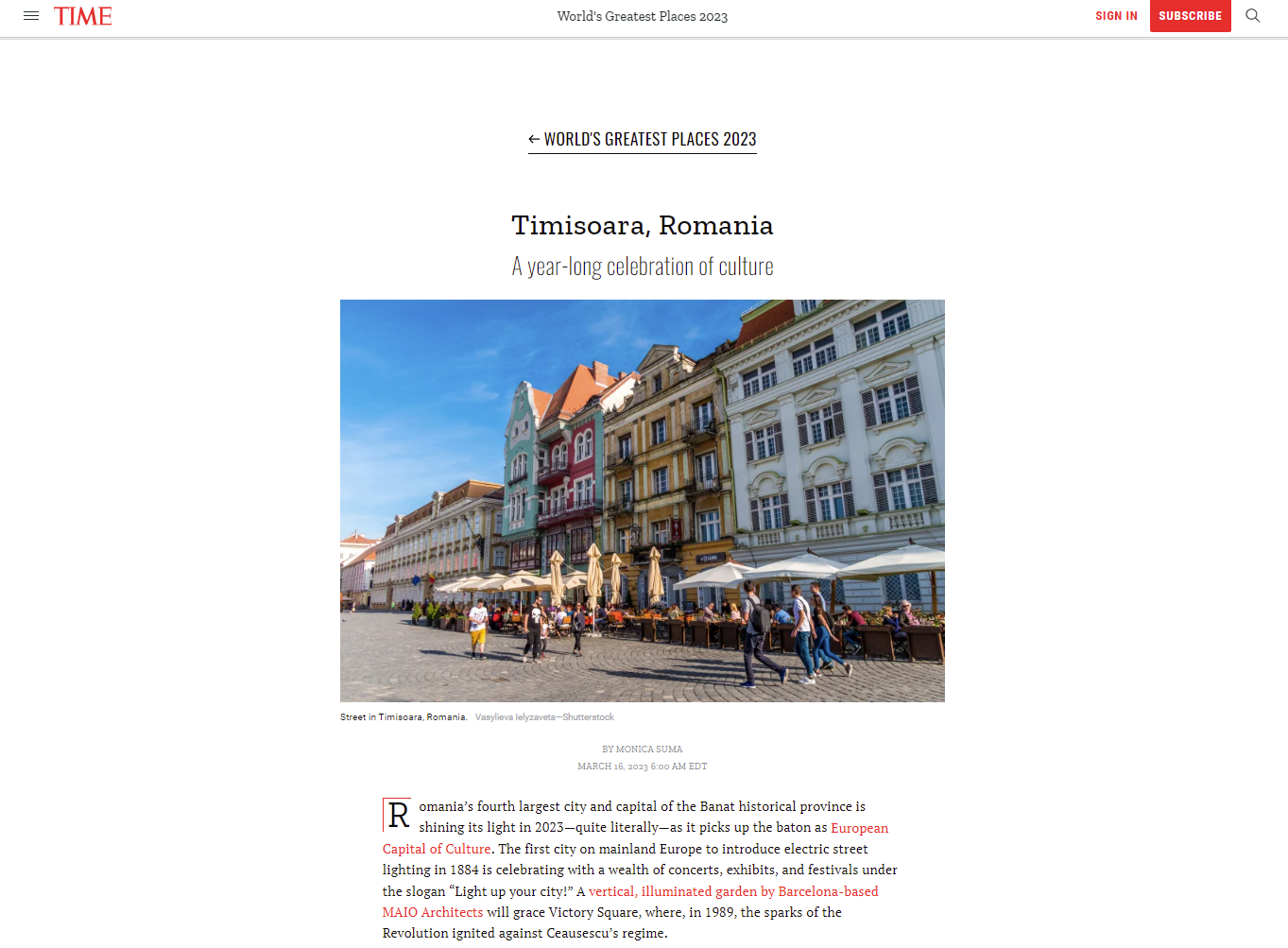 În articol, cei de la TIME spun că Timișoara strălucește literalmente, odată cu preluarea ștafetei de Capitală Europeană a Culturii, sărbătorind „prin intermediul unei varietăți de concerte, expoziții și festivaluri […] O grădină verticală, realizată de arhitecții MAIO, împodobește Piața Victoriei, locul în care, în 1989, scânteia Revoluției a fost aprinsă împotriva regimului Ceaușescu”.