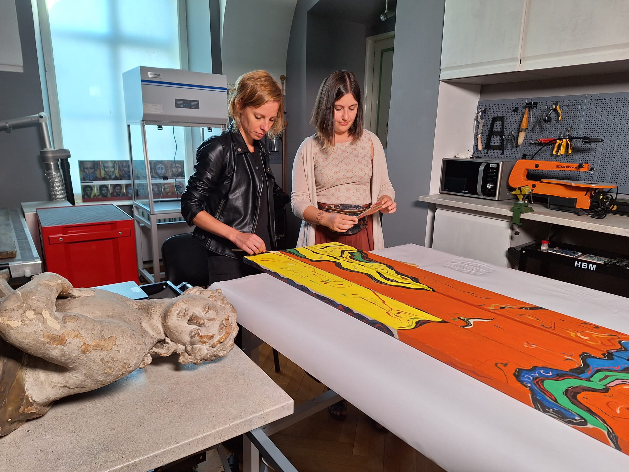 Magda Babău: Momentan lucrăm pentru o expoziție de artă contemporană dedicată artiștilor timișoreni din colecția muzeului, cum a spus și colega mea, expoziția se va numi Avangarda Timișoreană. Dar până în prezent am avut oportunitatea de a restaura lucrări pentru diverse expoziții organizate de Muzeul Național de Artă, complexe și de amploare. Aș vrea să amintesc expoziția permanentă de Artă Românească și de Artă Europeană, pentru reorganizarea căreia echipa de conservare-restaurare a depus un efort semnificativ.