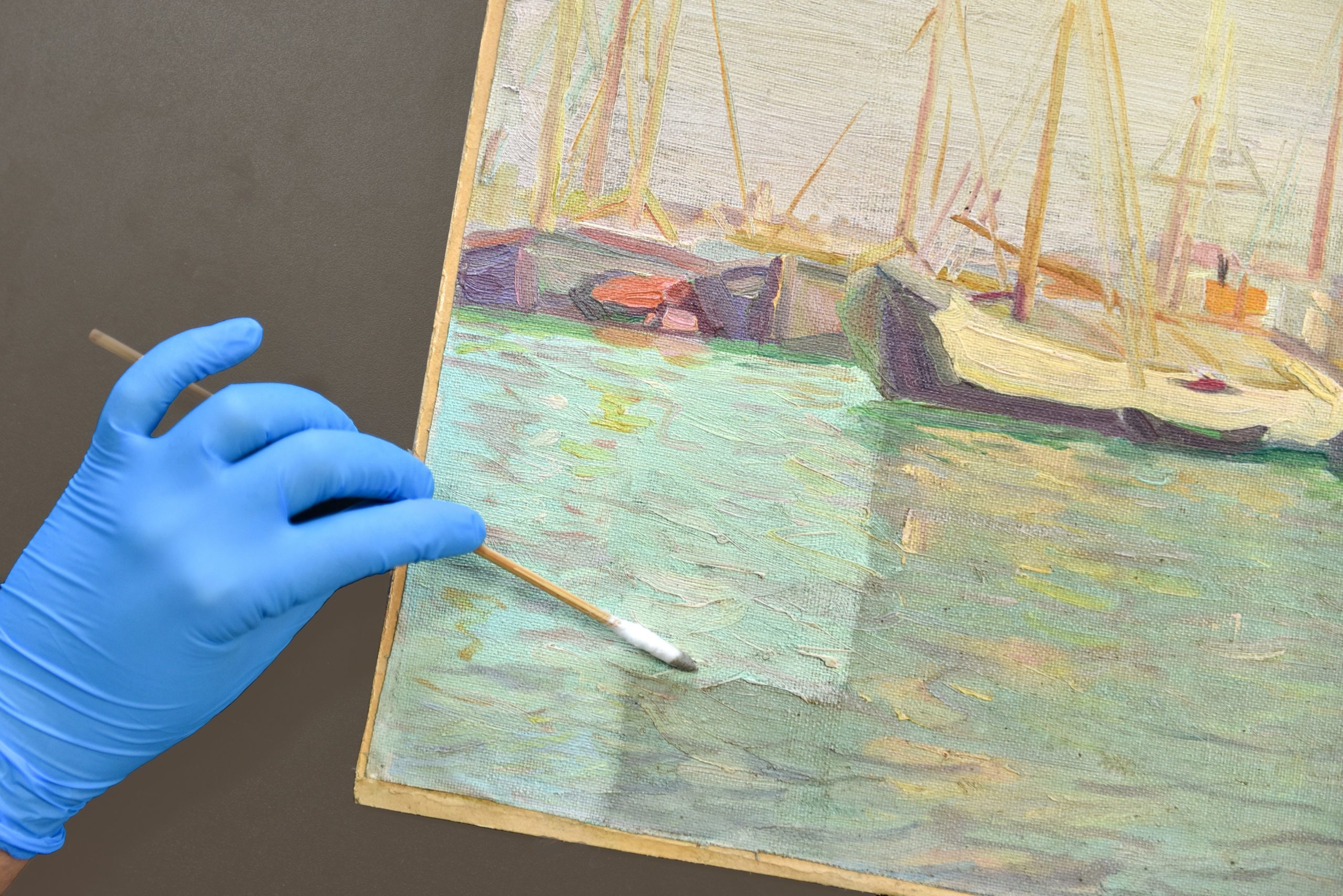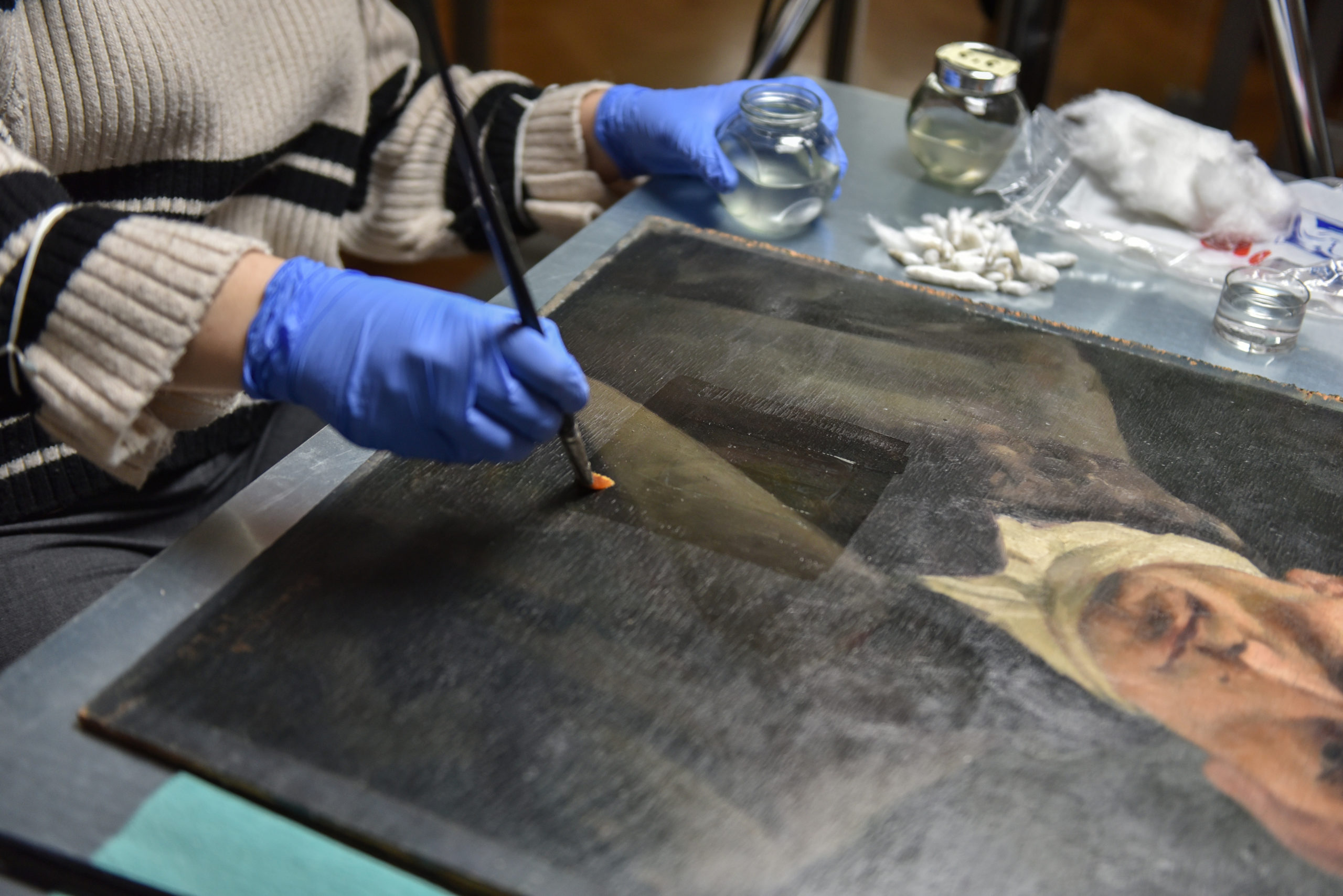 Magda Babău: Cea mai vizibilă operațiune pe care o desfășoară un restaurator este curățarea unei picturi pentru că, de-a lungul timpului, praful împreună cu alte murdării sau impurități se depun pe suprafața picturii și uneori fac ca aceasta să nu mai fie atât de vizibilă sau o întunecă din punct de vedere cromatic. În laboratorul vizitabil am observat că această etapă a curățării unei lucrări este cea mai captivantă pentru public deoarece se poate observa exact faptul că această etapă scoate la lumină culorile inițiale ale lucrării. Și, bineînțeles că fiecare lucrare are degradările ei specifice, pornind de la suportul lucrărilor, la stratul pictural sau cel protector de verni. Am avut de restaurant lucrări care au avut, de exemplu, pânza ruptă pentru care a trebuit să intervenim prin refacerea planeității pânzei pentru ca lucrările să poată fi expuse.