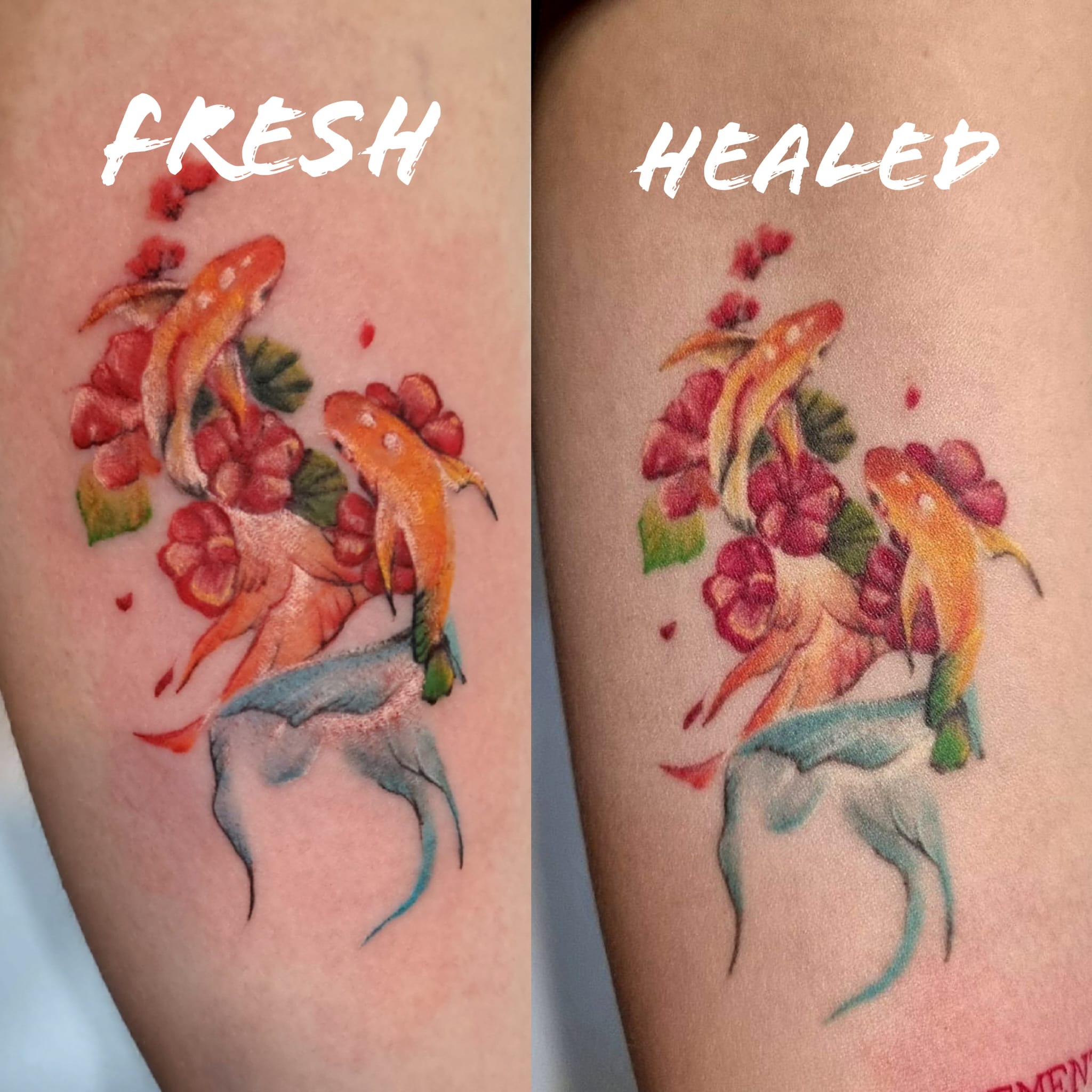 Pielea este lezată, ca la orice altă rană, este o rană superficială. Tatuajul nu intră profund în piele. Tatuajul ajunge într-o zonă despre care noi zicem că este dermo. Se înroșește toată zona și un perimetru pe lângă, se umflă și cam atât. Doare puțin, ustură puțin, e o senzație de căldură, nu-i nimic extraordinar, nu este nimic de nesuportat. Chestia cu nu are voie să ajungă apa, nu avem voie să ne spălăm este un mit. Trebuie să ne spălăm ca niște oameni normali. Aplic o folie specială când termin tatuajul, care se ține trei zile. După ce se dă folia jos, se spală tatuajul, se pune un pic de cremă și gata, se vindecă în două săptămâni, în general și în perioada asta nu se duc la piscină, sală, saună, solar, evită să meargă în locuri care sunt murdare sau cu potențial risc de infecție. Cineva care lucrează în construcții ar fi bine să aibă un concediu de măcar o săptămână.