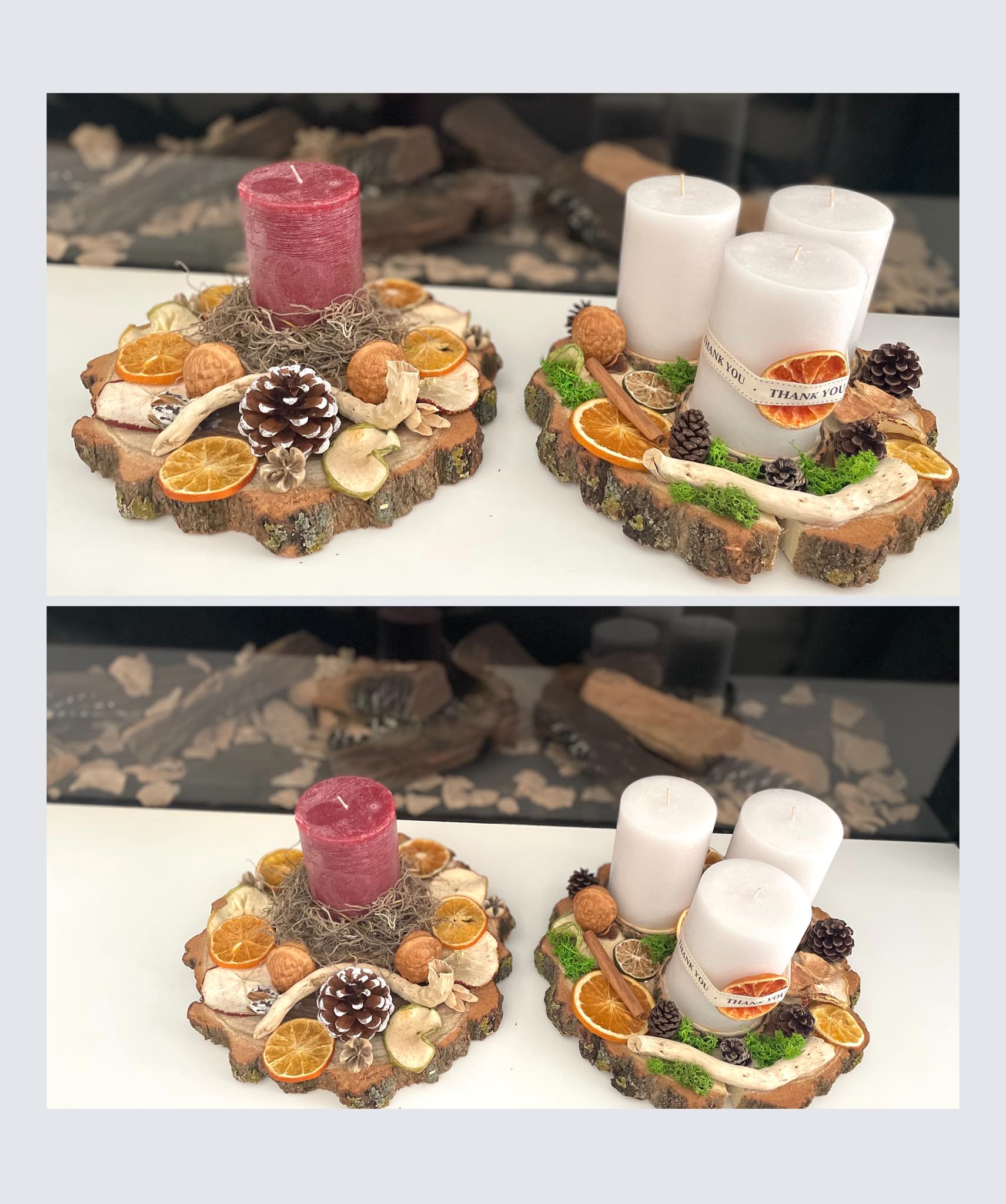 Am inclus într-un obiect de decor o ramură pe care am adus-o cu mașina din Thassos. Am mai făcut ornamente cu lumânări, orhidee, folosesc în general produse rezistente în timp. Deși am pictat pe pietre, nu mă tentează să mă apuc de pictură la alt nivel.