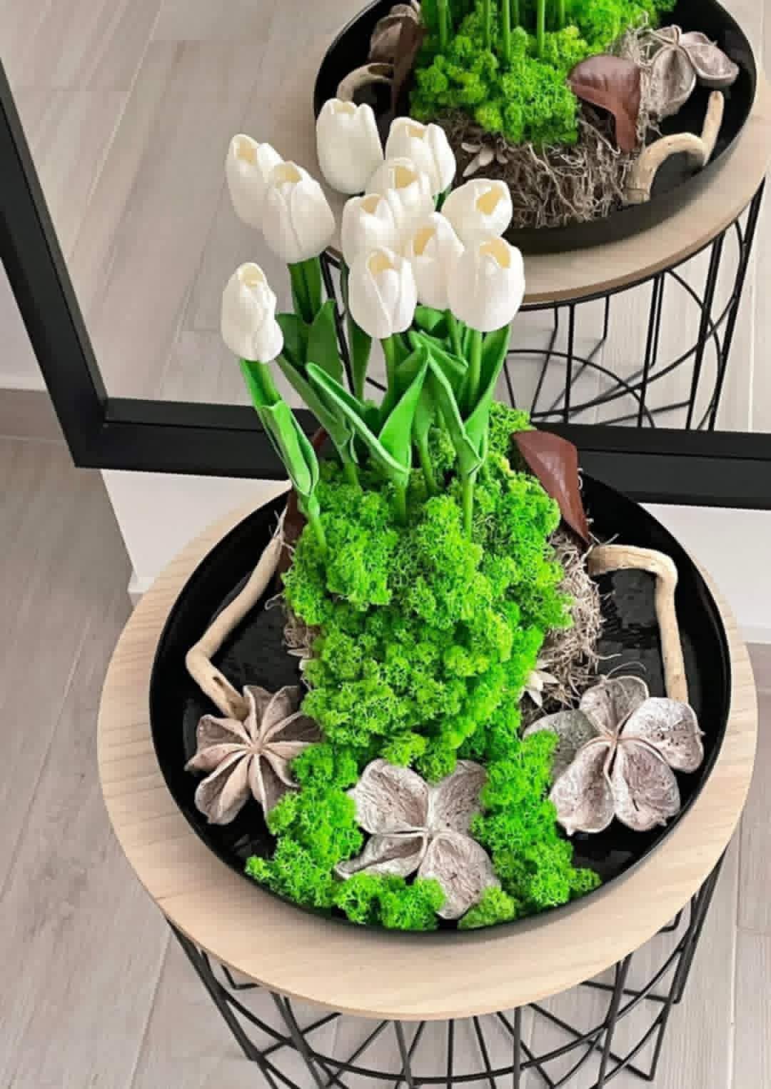 Inspirația e de moment, nu am o nișă. Dacă merg într-un magazin și văd materiale care mă inspiră sau îmi vine vreo idee le cumpăr și le folosesc. Am și materiale cumpărate de pe diverse site-uri, luate din pădure, de la munte, de la mare, le pun pe bancul de lucru și în momentul când îmi vine inspirația le găsesc câte o întrebuințare. Realizez tot felul de obiecte, cum ar fi tablou din ramuri și licheni, tavă cu licheni și nucă de cocos.