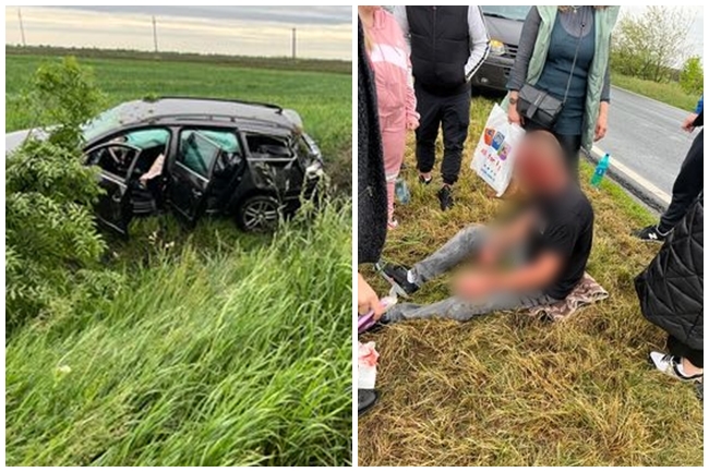 ATENȚIE! Imagini cu puternic impact emoțional. Accident de circulație, duminică după-masă, în apropiere de Cărpiniș. Două persoane au ajuns la spital, printre care și un copil de 7 ani, după ce un șofer ar fi ațipit la volan și a pierdut controlul mașinii. Autoturismul a ieșit de pe partea carosabilă și a intrat într-o grămadă de pământ.