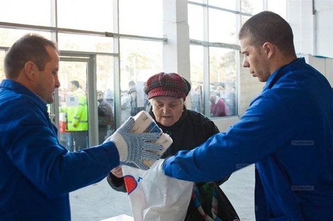 La auzul veştii că începând de miercuri se vor împărţi din nou ajutoare de la UE, timişorenii cu venituri reduse s-au aşezat la rând încă de cu seară, unii dintre ei, pentru a ridica primii produsele alimentare. Şomerii, pensionarii cu pensii sub 400 de lei pe lună şi alte persoane defavorizate primesc zahăr şi făină, zacuscă, roşii şi carne la conservă, paste făinoase şi ulei. Ar fi trebuit să primească şi miere de albine, dar autorităţile au hotărât să retragă acest produs din depozite pentru că nu era conform.