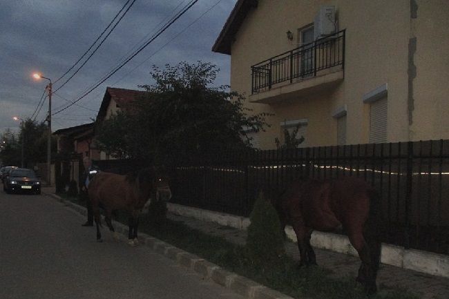 Spaţiile verzi de la marginea drumurilor din Timişoara sunt numai bune pentru păşunat. Asta a gândit un timişorean din zona Mircea cel Bătrân, care şi-a lăsat herghelia să pască printre vilele din zonă.