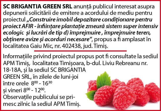 ADVERTORIAL. SC BRIGANTIA GREEN SRL anunta publicul interesat asupra depunerii solicitarii de emitere a acordului de mediu pentru proiectul „Construire imobil depozitare conditionare pentru proiect AFIR – infiintare plantatie zmeura sistem super intensiv ecologic si lucrari de tip d) imprejmuire , imprejmuire teren, obtinerer avize si acorduri necesare”, propus a fi amplasat in localitatea Gaiu Mic, nr. 402438, jud. Timis.