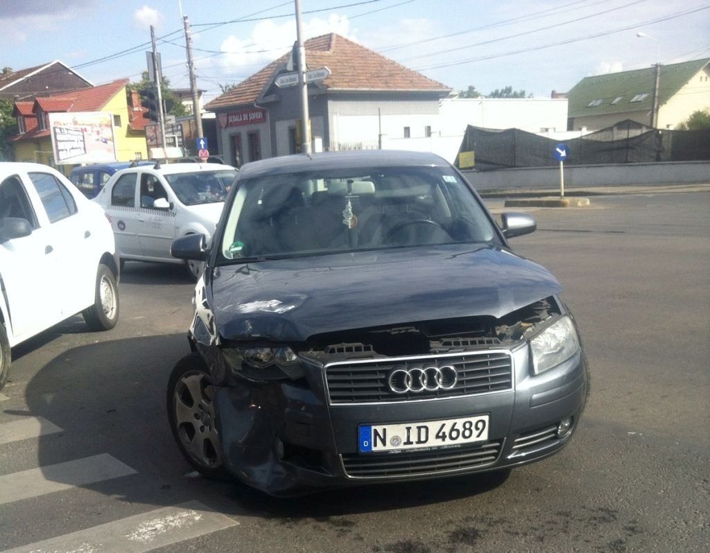 Accident de circulație, la coborârea de pe podul din Calea Șagului din Timișoara, vineri după-amiază. Două mașini s-au ciocnit violent, după ce un șofer nu a acordat prioritate.