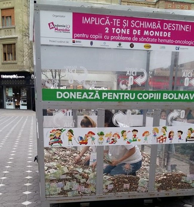 Un proiect frumos a demarat la Timișoara în urmă cu mai puțin de o lună - „Două tone de monede”. O cutie de mari dimensiuni, transparentă, este așezată în centrul orașului, vizavi de Catedrală, unde se pot dona bani pentru a se cumpăra medicamente copiilor cu afecțiuni hemato-oncologice. Cutia va mai sta acolo până în 15 aprilie, dar organizatorii au fost nevoiți să scoată bancnotele donate pentru că unele persoane au încercat să dea atacul la cutia de donații și să sustragă bani. Conform unor sesizări, unii au și reușit acest lucru...