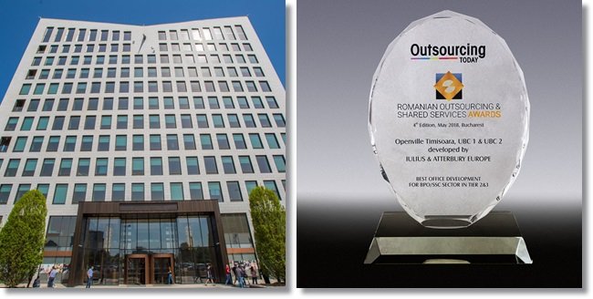 Companiile IULIUS şi Atterbury Europe au fost premiate cu distincția „Cea mai bună dezvoltare office pentru sectorul BPO/SSC din orașele secundare și terțiare”, în cadrul galei Romanian Outsourcing & Shared Services Awards 2018, care a avut loc la Bucureşti, săptămâna trecută. Premiul a fost acordat pentru cele două clădiri de birouri din ansamblul mixt Openville Timişoara inaugurate anul trecut: United Business Center 1 şi United Business Center 2. Distincţia recunoaște cea mai bună dezvoltare de birouri din orașele secundare și terțiare care oferă spații de lucru sănătoase, plăcute şi productive.