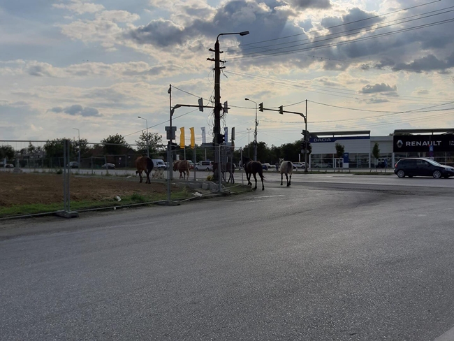 Spaţiile verzi de la marginea drumurilor din Timişoara sunt numai bune pentru păşunat. Asta a gândit un timişorean din zona Mircea cel Bătrân, care şi-a lăsat herghelia să pască printre vilele din zonă.
