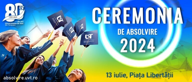 Avem plăcerea de a vă invita să participați la Ceremonia de Absolvire UVT 2024, dedicată promoției de absolvenți ai Universității de Vest din Timișoara (UVT) din acest an, eveniment care va fi organizat sâmbătă, 13 iulie, începând de la ora 10, în Piața Libertății din Timișoara, eveniment deschis pentru întreaga comunitate timișoreană.