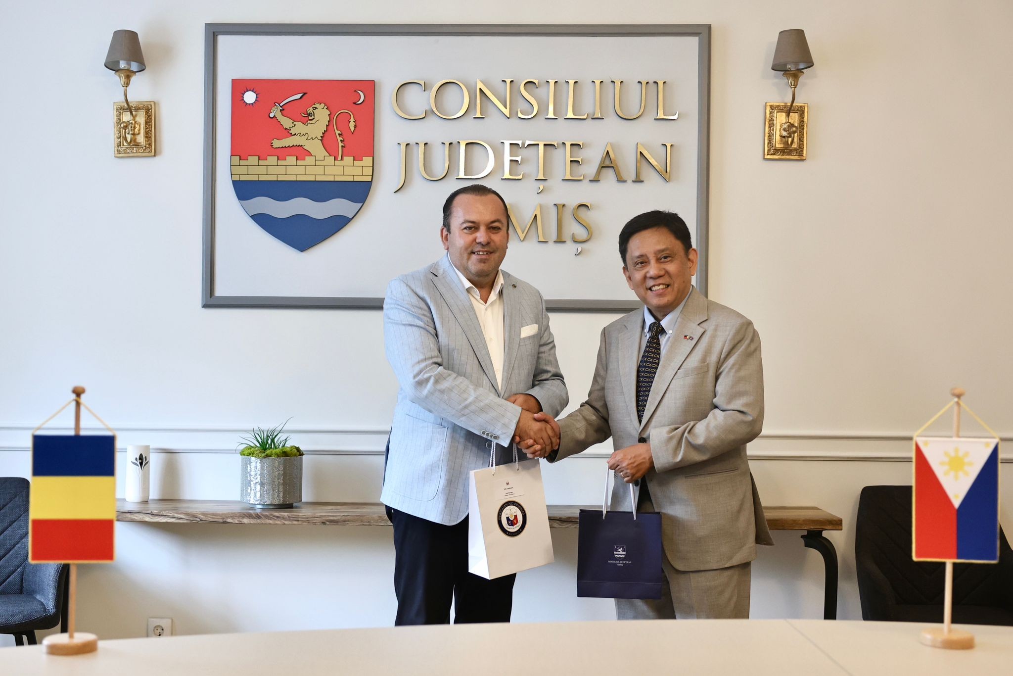 Alin Popoviciu, vicepreședintele Consiliului Județean Timiș, l-a primit la Palatul Administrativ pe Noel Eugene Eusebio Servigon, Ambasador Extraordinar și Plenipotențiar al Republicii Filipine. Cei doi au discutat despre inițierea legăturilor economice mai puternice, despre încurajarea turismului și posibile schimburi educaționale.