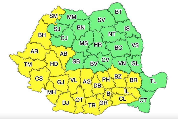 Avertizare meteorologică de tip Cod Galben de caniculă și disconfort termic valabilă, marți, în Timiș, Caraș-Severin, Arad, Bihor și Satu-Mare. Meteorologii anunță că vremea va fi caniculară, iar disconfortul termic va fi în creștere. De miercuri, codul galben va fi înlocuit de unul portocaliu, iar temperaturile vor fi cuprinse între 37 și 39 de grade celsius. Specialiștii spun că nopțile vor fi tropicale.