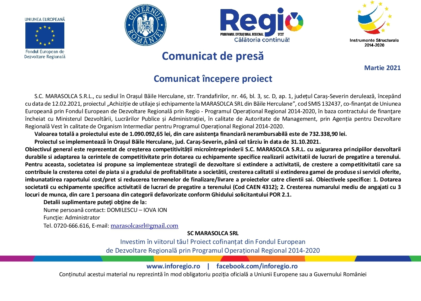 S.C. MARASOLCA S.R.L., cu sediul în Orașul Băile Herculane, str. Trandafirilor, nr. 46, bl. 3, sc. D, ap. 1, județul Caraș-Severin derulează, începând cu data de 12.02.2021, proiectul „Achiziție de utilaje și echipamente la MARASOLCA SRL din Băile Herculane”, cod SMIS 132437, co-finanţat de Uniunea Europeană prin Fondul European de Dezvoltare Regională prin Regio - Programul Operațional Regional 2014-2020, în baza contractului de finanţare încheiat cu Ministerul Dezvoltării, Lucrărilor Publice și Administrației, în calitate de Autoritate de Management, prin Agenția pentru Dezvoltare Regională Vest în calitate de Organism Intermediar pentru Programul Operațional Regional 2014-2020.