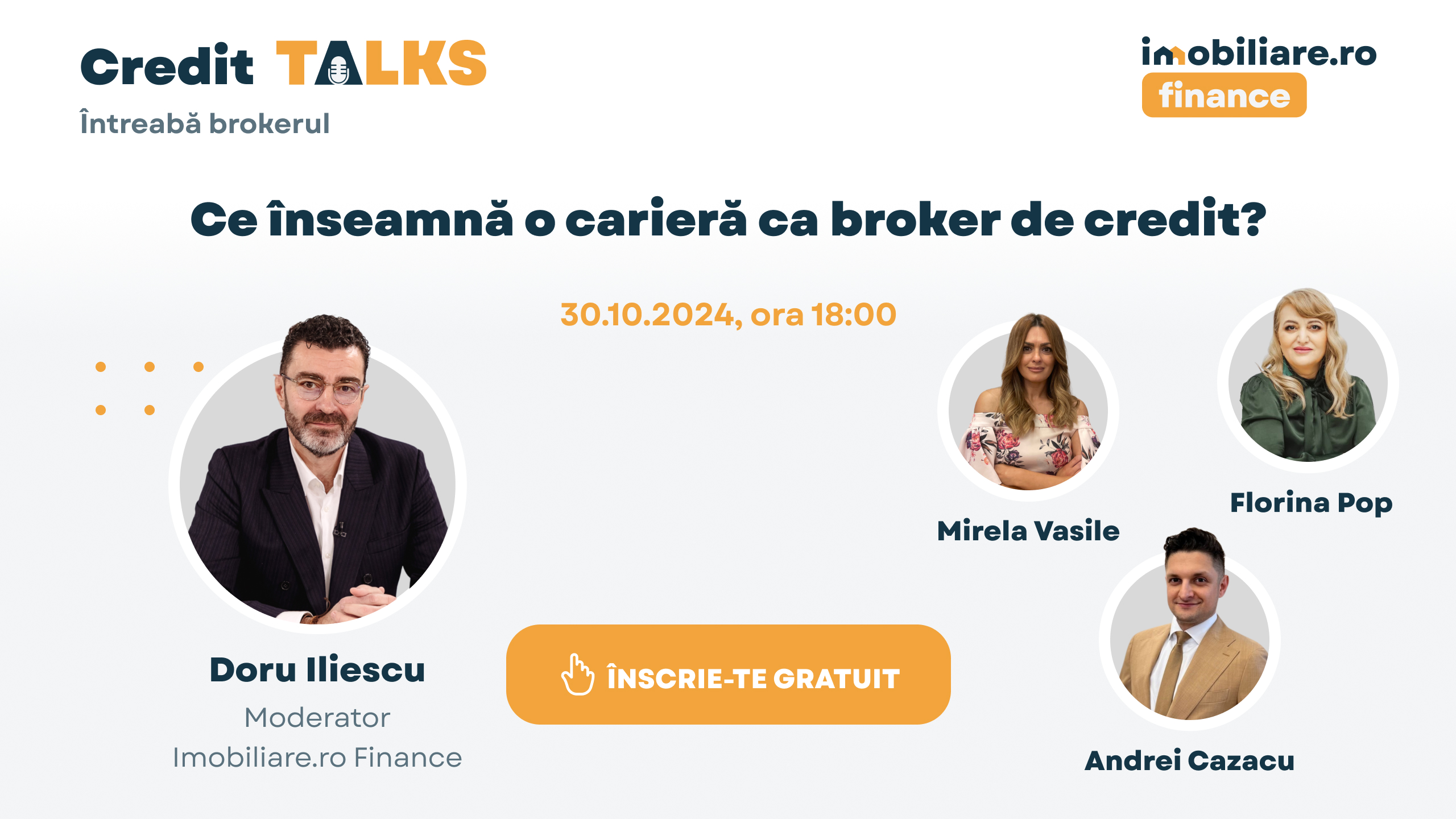 Îți dorești o carieră dinamică și plină de avantaje? Atunci, profesia de broker de credite ar putea fi pentru tine. Participă la webinarul „Credit Talks”, organizat de Imobiliare.ro Finance - brokerul de credite din cadrul grupului Imobiliare.ro, și află cum poți obține succesul într-o astfel de carieră.