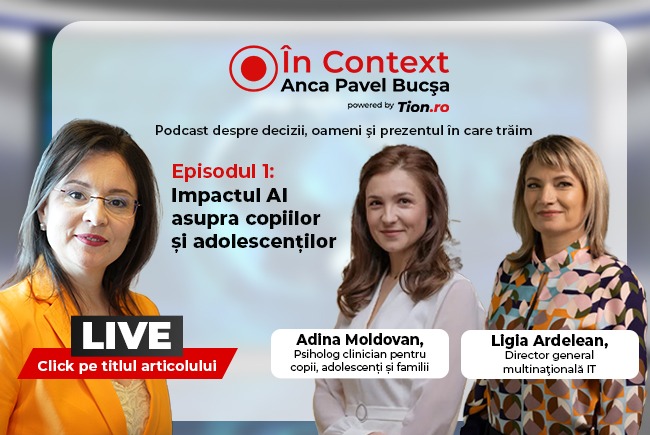 Urmăriți LIVE primul episod „În Context” cu Anca Pavel Bucșa: „Impactul AI asupra copiilor și adolescenților”.  Invitați:  Ligia Ardelean, director general companie IT  Adina Moldovan, psiholog clinician pentru copii, adolescenți și familii