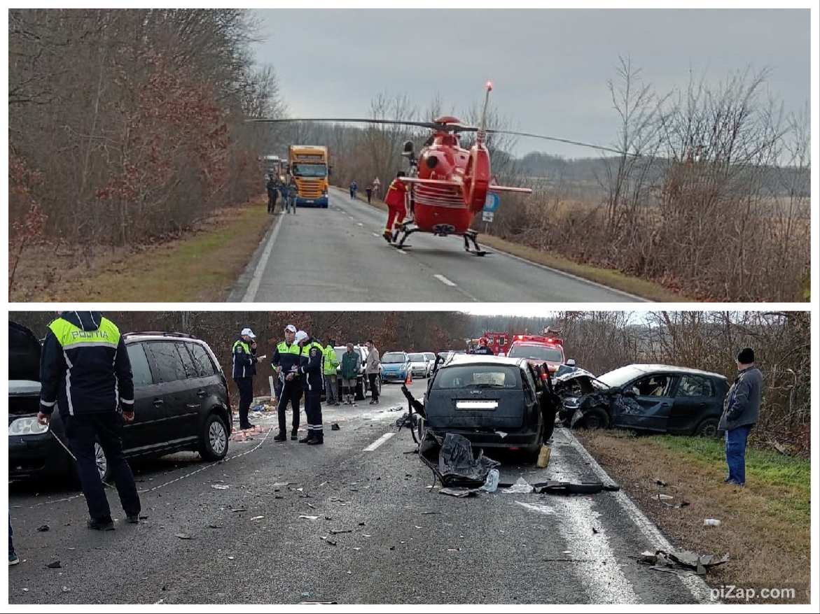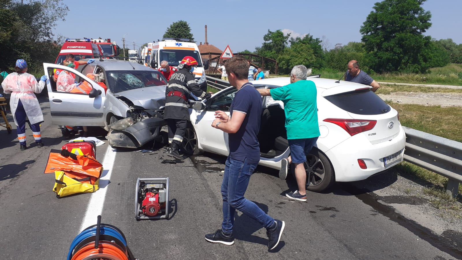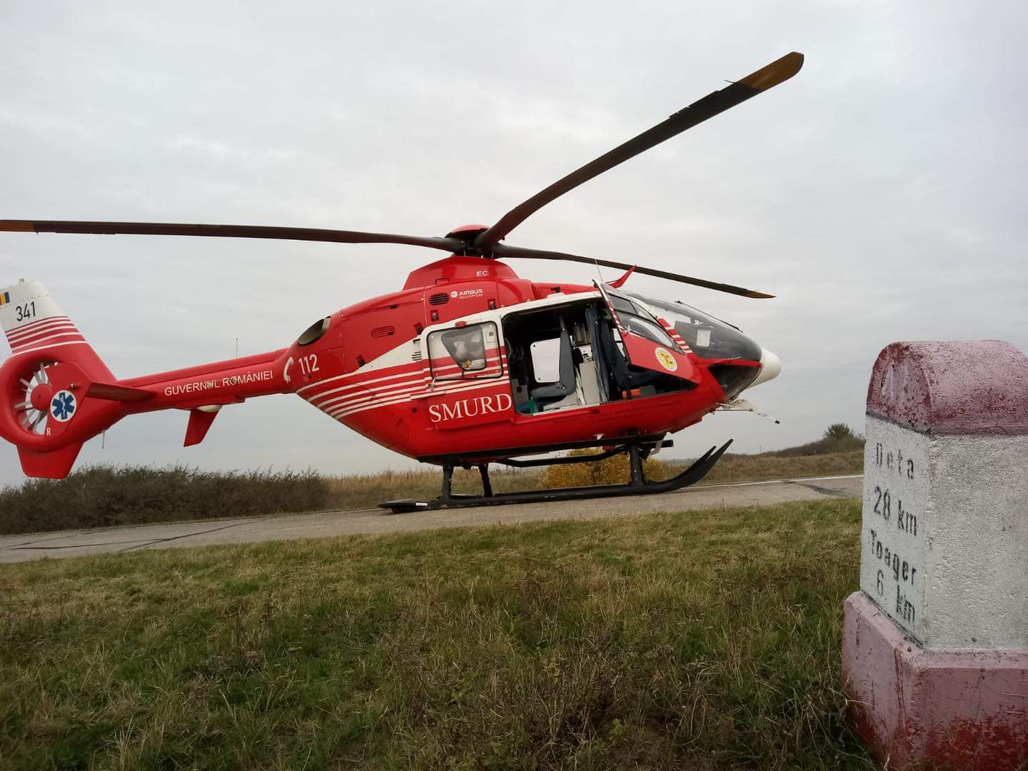 Patru persoane au nevoie de îngrijiri medicale în urma unui accident produs duminică în apropiere de localitatea timișeană Margina. Elicopterul SMURD s-a deplasat la fața locului pentru a prelua victimele. UPDATE. Un cățel aflat într-una din mașinile implicate în accident a fost salvat de pompieri